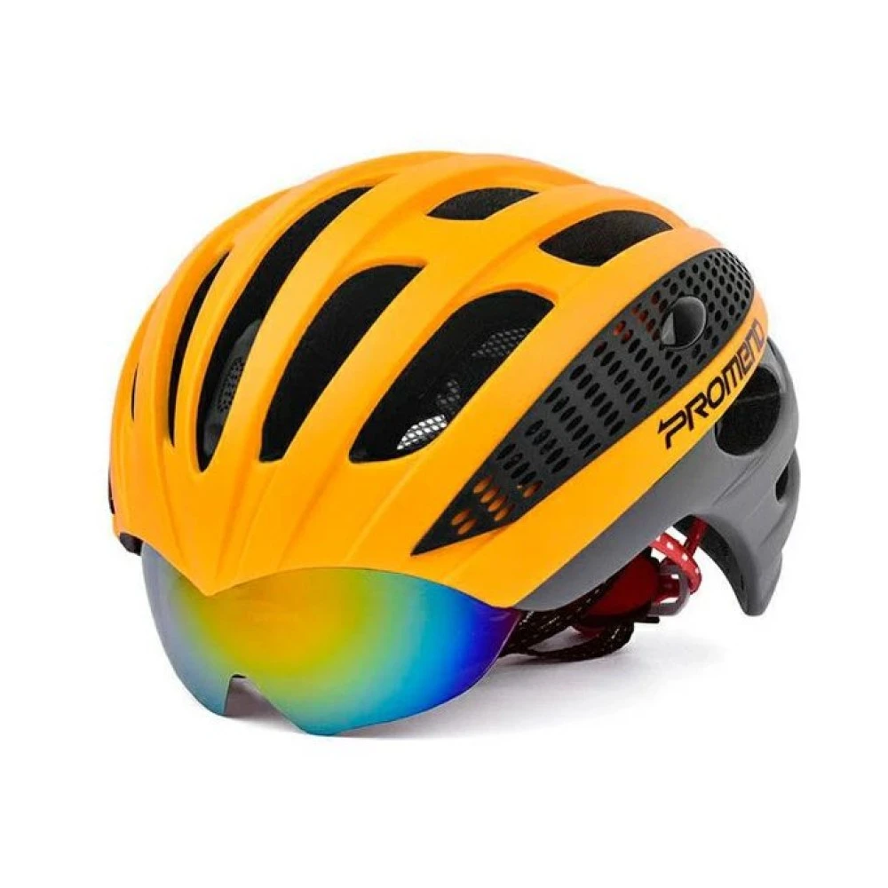 Шлем велосипедный PROMEND G3 черно-оранжевый предназначен для скоростной и продолжительной езды. Модный дизайн подчеркивает серьезные намерения райдера, особый подход к выбору аксессуара. Конструкция представлена обтекаемой формой. Поверхностная часть оснащена 27 воздушными отверстиями, обеспечивающими отличную воздухопроницаемость, исключающими запотевание и дискомфорт. Фиксация аксессуара проводится с с помощью надежного ремешка. Мобильный визор обеспечивает защиту от попадания грязи и пыли в лицо райдера. Комплектация из трехцветных линз гарантирует комфортную езду и отличную видимость в разной время суток.