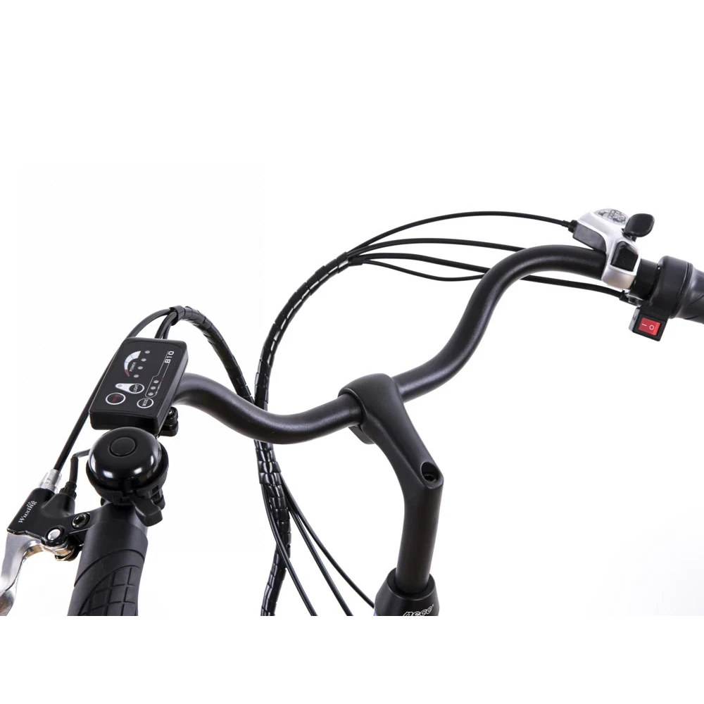 Складная конструкция рамы изготовлена из инновационного сплава алюминия, выдерживающего максимальные нагрузки. На подседельном штыре установлена батарея емкостью 8 А*ч. Штырь регулируется по высоте, рулевая часть электровелосипеда – по высоте и углу наклона. Переключение скоростей (7) проводится с помощью половинчатой ручки, размещенной на рулевой части.