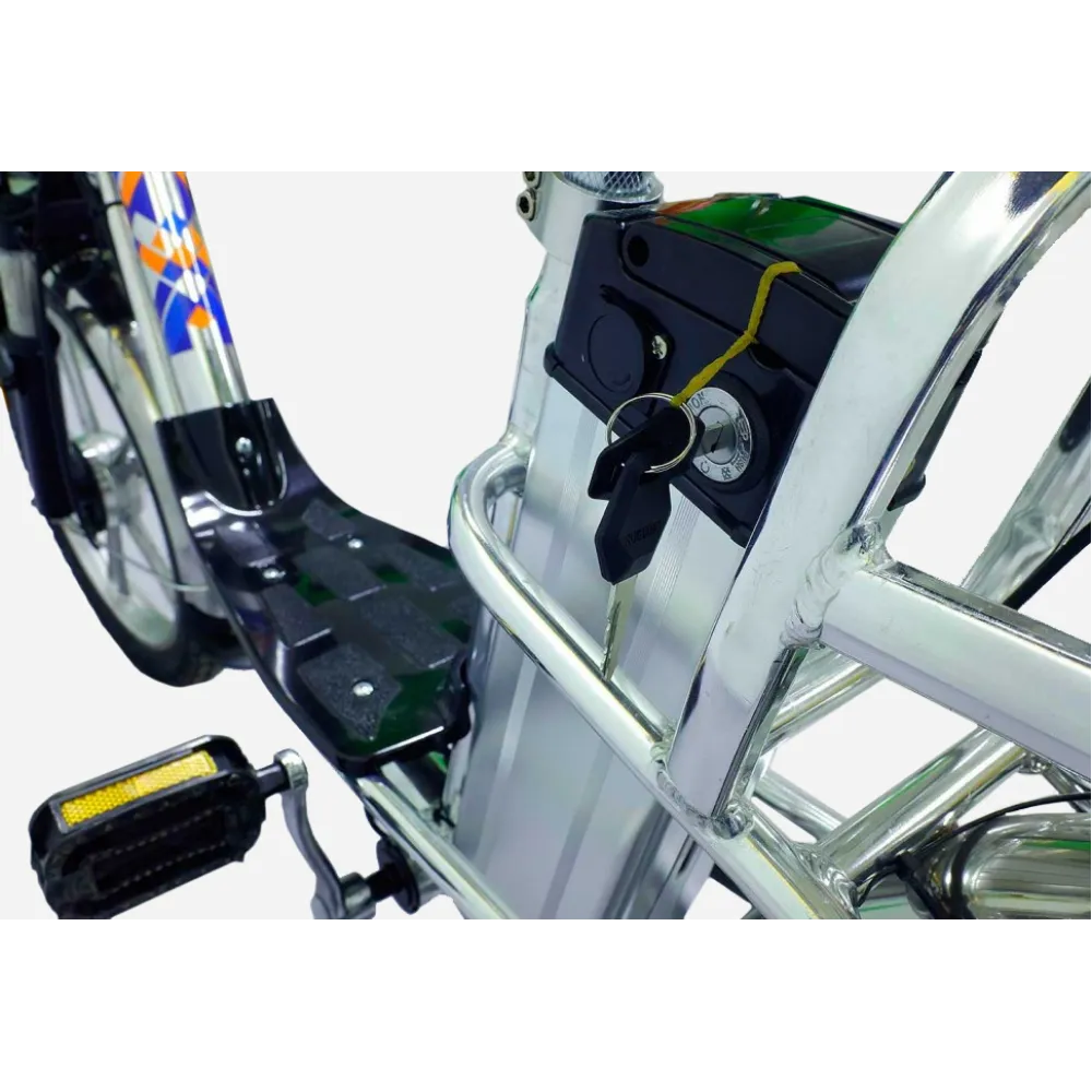 При мощности двигателя 350 Вт техника способна развивать скорость до 45 км/час и преодолевать на одной подзарядке 55 км пути, на педальном режиме – в 1.5-2 раза больше. Емкая АКБ на 13 Аh закреплена за сиденьем райдера, не мешает при переходе на педальный режим.