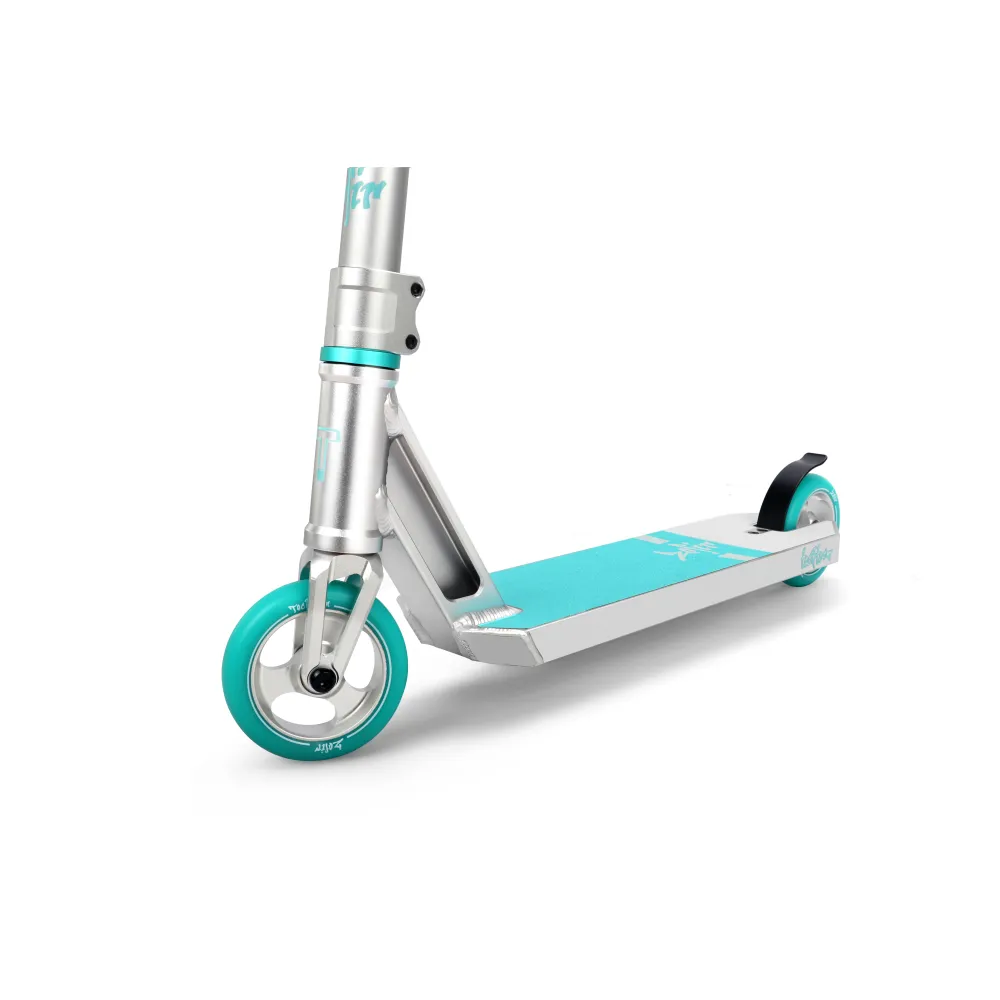 Этот трюковый самокат создан для профессиональной езды в парке. Скоростные колёса диаметром 110 мм, выполнены из алюминия, придают самокату максимальную скорость. Манёвренность и хороший отскок самоката обеспечивает покрытие колёс из полиуретана 88А, имеющих ширину 26 мм. У самоката имеются высококачественные подшипниками АВЕС 9, придающие самокату хороший накат.
